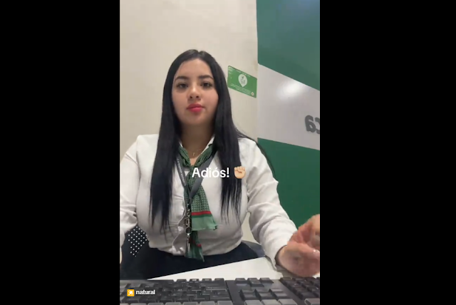 Estefanía aprovecha cuando no hay clientes en la sucursal para mandar saludos a sus amigos y seguidores sin embargo esta logrando cientos de likes cuando ya no tiene su uniforme.
